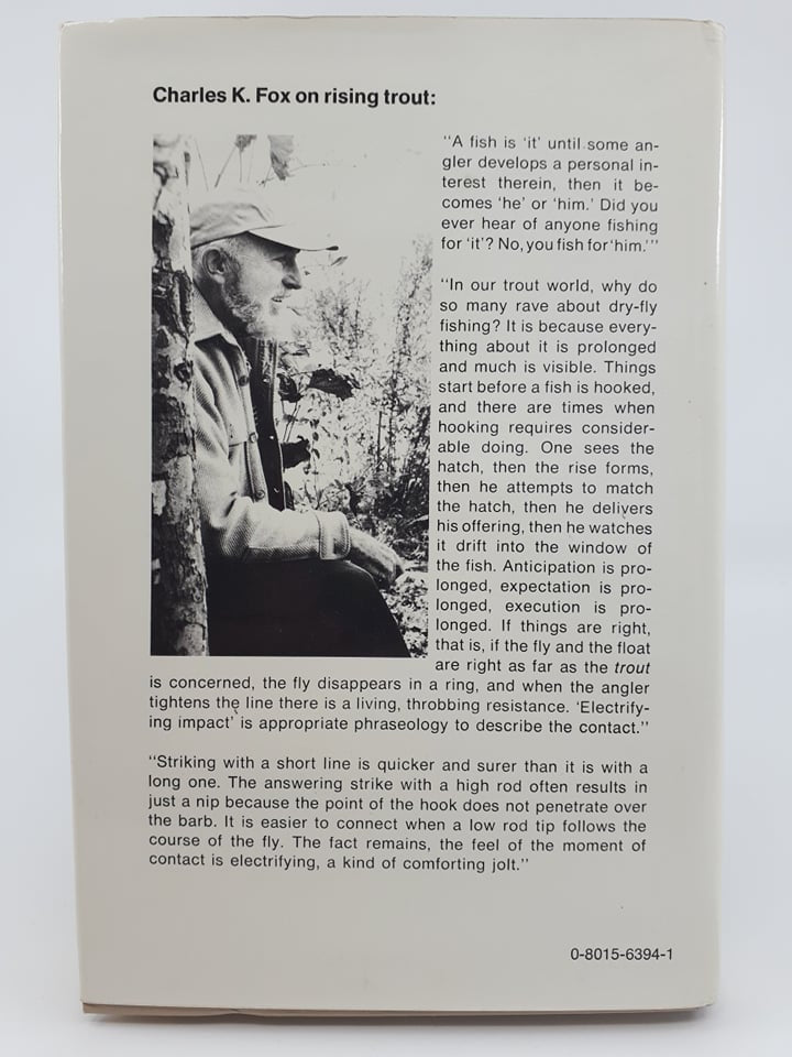 Rising Trout by Charles K. Fox. 1978. Second edition. Hawthorn Books, New York, New York. Rising Trout is a compilation of the observations, discoveries, and informed opinions of a man who knows trout as hardly any other person can claim to. It is an appreciative survey of past and current writing about trout; it is a review of the habits and habitats of North America's most popular freshwater game species. Hardcover, very good condition.